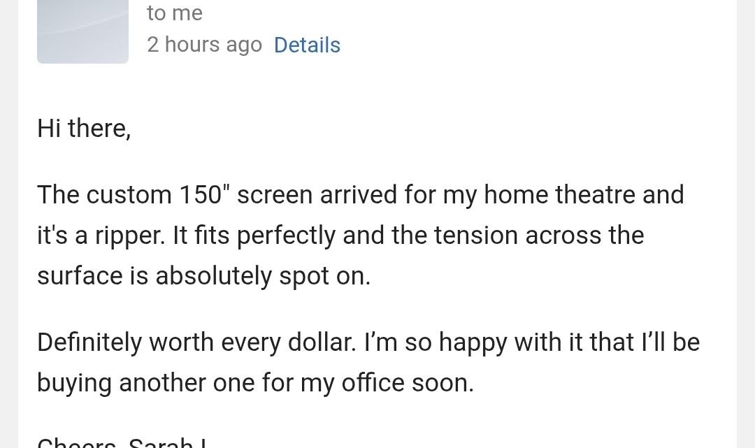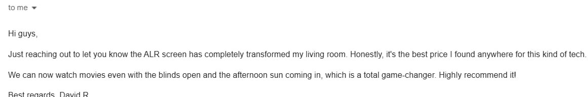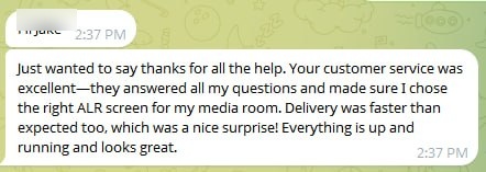 "Just wanted to say thanks for all the help. Your customer service was excellentβthey answered all my questions and made sure I chose the right ALR screen for my media room. Delivery was faster than expected too, which was a nice surprise! Everything is up and running and looks great."