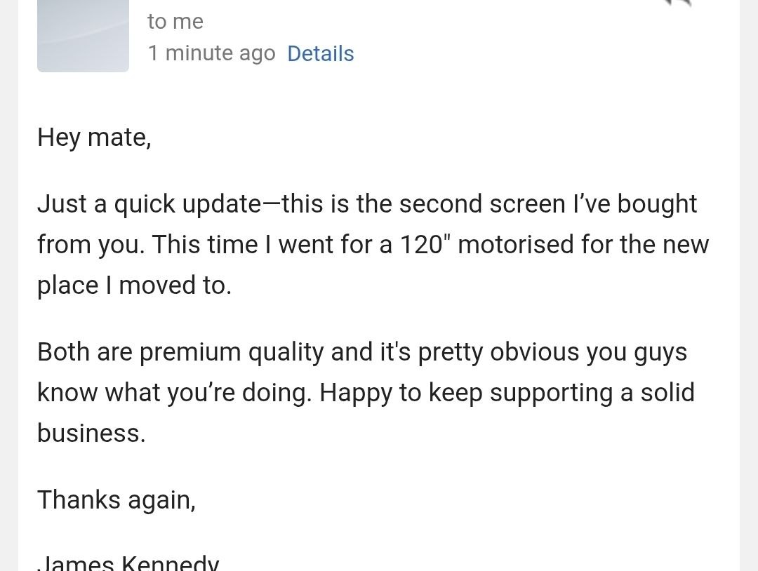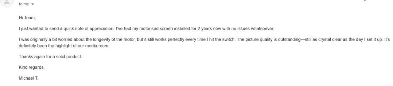 "Second screen I've bought from them. This time got a 120" motorised. Both are premium quality. you guys know what you're doing."
